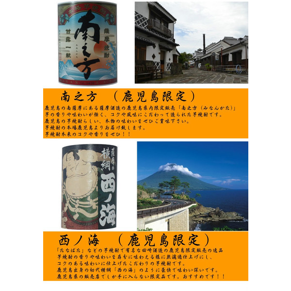 トップページ焼酎ギフトセット 送料無料 鹿児島限定芋焼酎 飲み比べ2本セット 南之方、西ノ海 25度 900ml×2本 化粧箱入り 価格: ¥3,740 (税込) [ポイント還元 37ポイント~] 販売期間: のし: ご希望の熨斗をお選びください。 選択してください 不要 お誕生日おめでとうございます お父さんいつもありがとう お母さんいつもありがとう 御祝 御礼 内祝 御誕生日祝 還暦祝 退職祝 寿 感謝 御樽 志(仏用) 表書きナシ その他(備考欄へご入力ください) 包装紙: 包装紙をお選びください。 選択してください 不要 黒ストライプ モダンブルー グリーン 花柄 お祝い メッセージ: ご希望のメッセージカードをお選びください。 選択してください 不要 お父さんいつもありがとう お母さんいつもありがとう お誕生日おめでとう! いつまでもお元気で! その他(備考欄へご入力下さい) 北海道・東北地方は別途送料500円です。: 選択してください 了承しました。 数量: セット 在庫: ○ 在庫 ○ 返品についての詳細はこちら 鹿児島限定販売の「南之方」と「西ノ海」 送料無料の900ml 2本ギフトセットになります。 鹿児島の芋焼酎らしくコクのある味わいや、しっかりとした香りがある2本。 化粧箱入りで包装、のし、メッセージカードも承っております。 関連商品 送料無料 鶴乃泉、天狗櫻 25度 900ml 2本セット 限定焼酎 芋焼酎飲み比べセット ギフト対応 人気専門誌ダンチュウ掲載アイテム ¥4,027(税込) 送料無料 ウルトラ怪獣コラボ 宇宙焼酎飲み比べセット 25度 720ml 3本 バルタン星人、ゼットン、ジャミラ 化粧箱入り ¥5,072(税込) 送料無料 鹿児島限定 3本飲み比べセット 南之方、佐多岬、芋感謝 25度 1800ml×3本 ¥7,480(税込) [鶴セット] 真鶴 鶴乃泉 南部鶴 手造り鶴乃泉 織鶴 鶴の一声 25度 1800ml 6本セット 限定焼酎 送料無料 芋焼酎飲み比べセット ¥15,980(税込) 送料無料 鹿児島限定 6本飲み比べセット 芋焼酎25度 1800ml×6本 通販 ¥13,920(税込) 送料無料 芋焼酎 6本飲み比べセット 伊佐美、三岳、鶴乃泉、他鹿児島限定焼酎3本 25度 1800ml×6本 ¥14,620(税込) 送料無料 鹿児島限定 6本飲み比べセット 芋焼酎 25度 900ml×6本 通販 ¥7,860(税込) 萬膳 まんぜん 25度 1800ml 万膳酒造 特約店限定 定価 通販 芋焼酎 ¥4,015(税込) 甑州 そしゅう 25度 1800ml 芋焼酎 吉永酒造 限定焼酎 鹿児島 通販 ¥3,520(税込) 剣 つるぎ 25度 1800ml 芋焼酎 神酒造 限定焼酎 鹿児島 通販 ¥3,377(税込) 海 うみ 25度 1800ml 芋焼酎 大海酒造 限定焼酎 鹿児島 定価 通販 ¥3,089(税込) 五代目和助 25度 1800ml 芋焼酎 白金酒造 限定焼酎 鹿児島 通販 ¥2,432(税込) ないな 25度 1800ml 芋焼酎 明石酒造 限定焼酎 通販 ¥2,772(税込) 薩摩茶屋 さつまちゃや 25度 1800ml 芋焼酎 村尾酒造 通販 ¥2,380(税込)